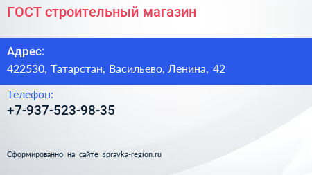 ГОСТ, строительный магазин по адресу 422530, Татарстан, Васильево, Ленина, 42 в дальнейшем Организация, размещена в следующих категориях: