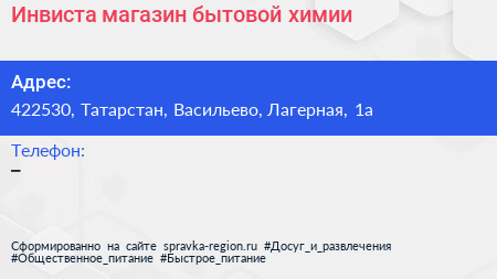 Инвиста, магазин бытовой химии по адресу 422530, Татарстан, Васильево, Лагерная, 1а в дальнейшем Организация, размещена в следующих категориях:
