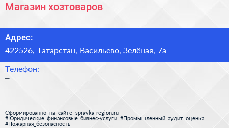 Магазин хозтоваров по адресу 422526, Татарстан, Васильево, Зелёная, 7а в дальнейшем Организация, размещена в следующих категориях: