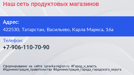 Наш, сеть продуктовых магазинов по адресу 422530, Татарстан, Васильево, Карла Маркса, 16а в дальнейшем Организация, размещена в следующих категориях:
