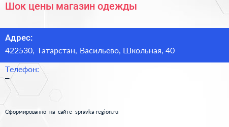 Шок цены, магазин одежды по адресу 422530, Татарстан, Васильево, Школьная, 40 в дальнейшем Организация, размещена в следующих категориях: