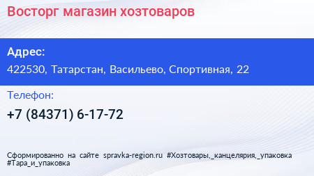 Восторг, магазин хозтоваров по адресу 422530, Татарстан, Васильево, Спортивная, 22 в дальнейшем Организация, размещена в следующих категориях: