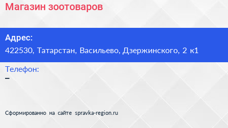 Магазин зоотоваров по адресу 422530, Татарстан, Васильево, Дзержинского, 2 к1 в дальнейшем Организация, размещена в следующих категориях: