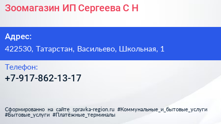 Зоомагазин, ИП Сергеева С.Н. по адресу 422530, Татарстан, Васильево, Школьная, 1 в дальнейшем Организация, размещена в следующих категориях: