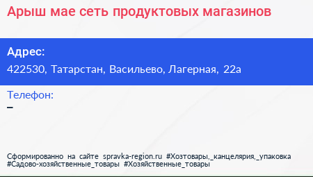 Арыш мае, сеть продуктовых магазинов по адресу 422530, Татарстан, Васильево, Лагерная, 22а в дальнейшем Организация, размещена в следующих категориях: