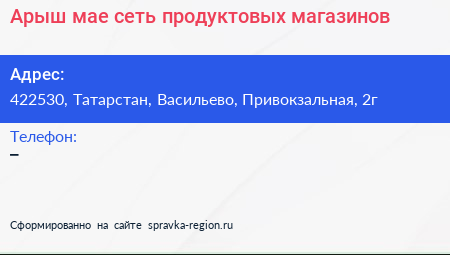 Арыш мае, сеть продуктовых магазинов по адресу 422530, Татарстан, Васильево, Привокзальная, 2г в дальнейшем Организация, размещена в следующих категориях: