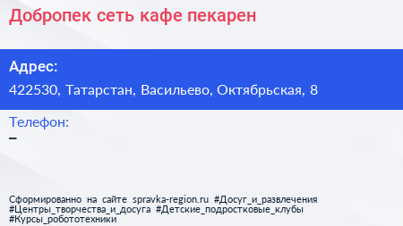 Добропек, сеть кафе-пекарен по адресу 422530, Татарстан, Васильево, Октябрьская, 8 в дальнейшем Организация, размещена в следующих категориях: