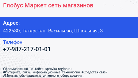 Глобус Маркет, сеть магазинов по адресу 422530, Татарстан, Васильево, Школьная, 3 в дальнейшем Организация, размещена в следующих категориях: