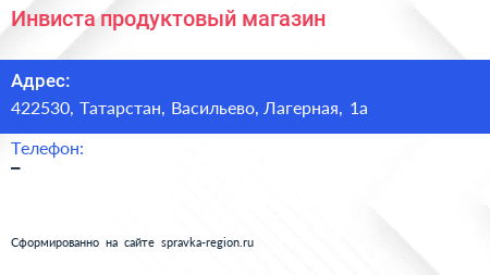 Инвиста, продуктовый магазин по адресу 422530, Татарстан, Васильево, Лагерная, 1а в дальнейшем Организация, размещена в следующих категориях: