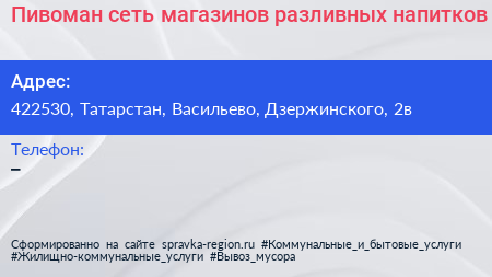 Пивоман, сеть магазинов разливных напитков по адресу 422530, Татарстан, Васильево, Дзержинского, 2в в дальнейшем Организация, размещена в следующих категориях: