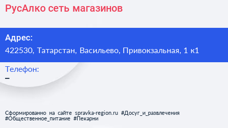 РусАлко, сеть магазинов по адресу 422530, Татарстан, Васильево, Привокзальная, 1 к1 в дальнейшем Организация, размещена в следующих категориях: