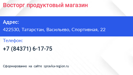 Восторг, продуктовый магазин по адресу 422530, Татарстан, Васильево, Спортивная, 22 в дальнейшем Организация, размещена в следующих категориях: