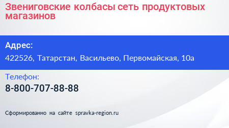 Звениговские колбасы, сеть продуктовых магазинов по адресу 422526, Татарстан, Васильево, Первомайская, 10а в дальнейшем Организация, размещена в следующих категориях:
