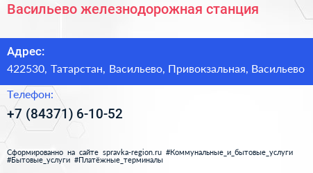Васильево, железнодорожная станция по адресу 422530, Татарстан, Васильево, Привокзальная, Васильево в дальнейшем Организация, размещена в следующих категориях: