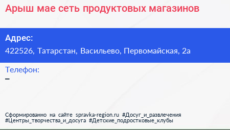 Арыш мае, сеть продуктовых магазинов по адресу 422526, Татарстан, Васильево, Первомайская, 2а в дальнейшем Организация, размещена в следующих категориях: