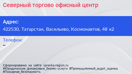 Северный, торгово-офисный центр по адресу 422530, Татарстан, Васильево, Космонавтов, 48 к2 в дальнейшем Организация, размещена в следующих категориях: