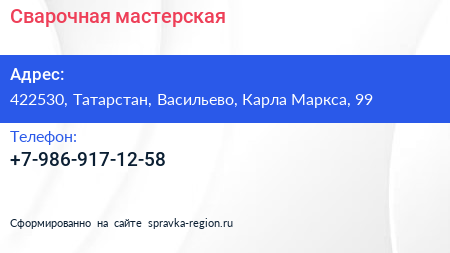 Сварочная мастерская по адресу 422530, Татарстан, Васильево, Карла Маркса, 99 в дальнейшем Организация, размещена в следующих категориях: