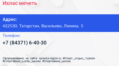 Ихлас, мечеть по адресу 422530, Татарстан, Васильево, Ленина, 5 в дальнейшем Организация, размещена в следующих категориях: