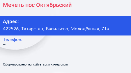 Мечеть, пос. Октябрьский по адресу 422526, Татарстан, Васильево, Молодёжная, 71а в дальнейшем Организация, размещена в следующих категориях: