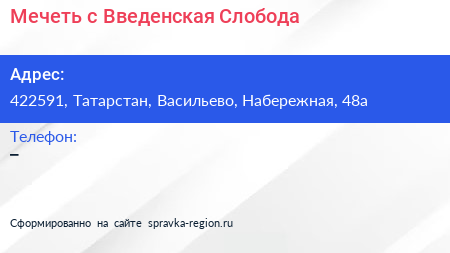 Мечеть, с. Введенская Слобода по адресу 422591, Татарстан, Васильево, Набережная, 48а в дальнейшем Организация, размещена в следующих категориях: