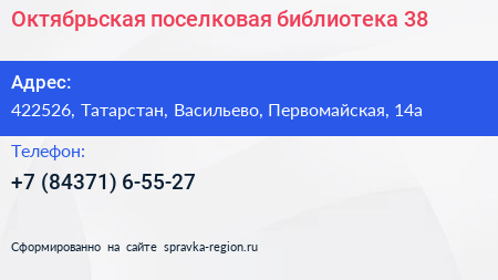Октябрьская поселковая библиотека №38 по адресу 422526, Татарстан, Васильево, Первомайская, 14а в дальнейшем Организация, размещена в следующих категориях: