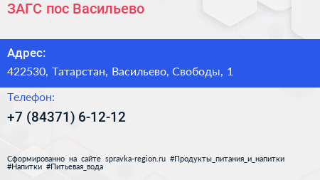 ЗАГС, пос. Васильево по адресу 422530, Татарстан, Васильево, Свободы, 1 в дальнейшем Организация, размещена в следующих категориях: