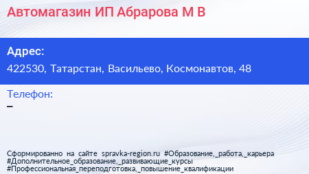 Автомагазин, ИП Абрарова М.В. по адресу 422530, Татарстан, Васильево, Космонавтов, 48 в дальнейшем Организация, размещена в следующих категориях: