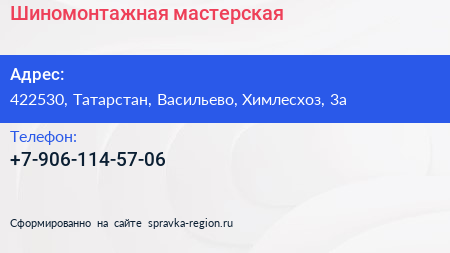 Шиномонтажная мастерская по адресу 422530, Татарстан, Васильево, Химлесхоз, 3а в дальнейшем Организация, размещена в следующих категориях: