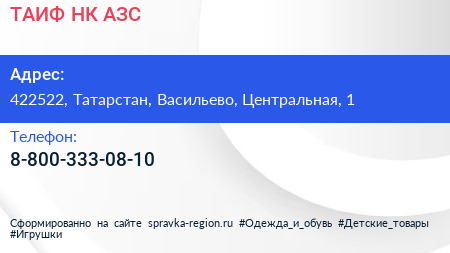 ТАИФ-НК АЗС по адресу 422522, Татарстан, Васильево, Центральная, 1 в дальнейшем Организация, размещена в следующих категориях: