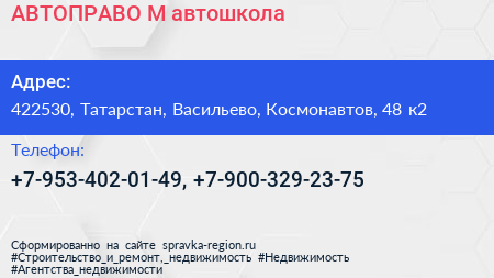 АВТОПРАВО-М, автошкола по адресу 422530, Татарстан, Васильево, Космонавтов, 48 к2 в дальнейшем Организация, размещена в следующих категориях: