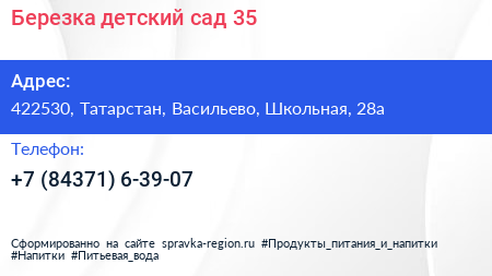 Березка, детский сад №35 по адресу 422530, Татарстан, Васильево, Школьная, 28а в дальнейшем Организация, размещена в следующих категориях: