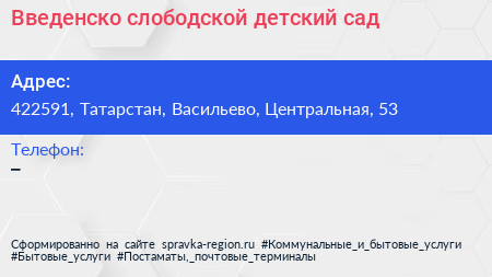 Введенско-слободской детский сад по адресу 422591, Татарстан, Васильево, Центральная, 53 в дальнейшем Организация, размещена в следующих категориях: