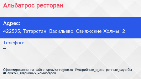 Альбатрос, ресторан по адресу 422595, Татарстан, Васильево, Свияжские Холмы, 2 в дальнейшем Организация, размещена в следующих категориях:
