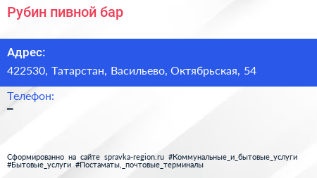 Рубин, пивной бар по адресу 422530, Татарстан, Васильево, Октябрьская, 54 в дальнейшем Организация, размещена в следующих категориях: