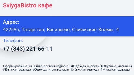 SviygaBistro, кафе по адресу 422595, Татарстан, Васильево, Свияжские Холмы, 4 в дальнейшем Организация, размещена в следующих категориях:
