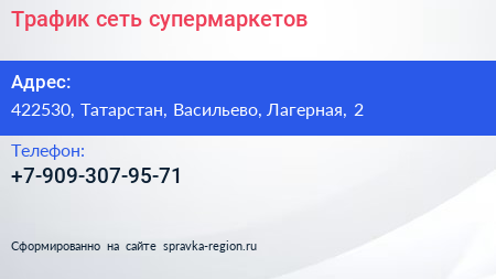 Трафик, сеть супермаркетов по адресу 422530, Татарстан, Васильево, Лагерная, 2 в дальнейшем Организация, размещена в следующих категориях: