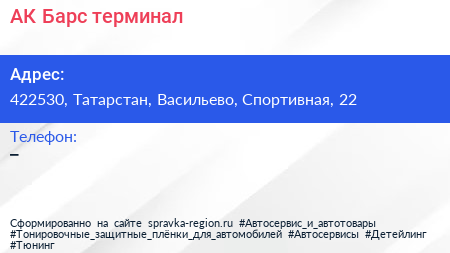 АК Барс, терминал по адресу 422530, Татарстан, Васильево, Спортивная, 22 в дальнейшем Организация, размещена в следующих категориях: