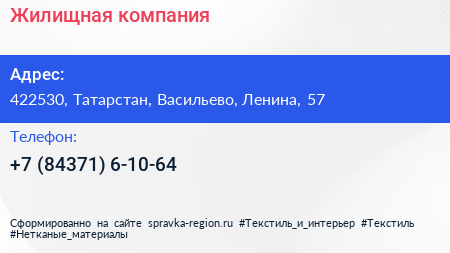 Жилищная компания по адресу 422530, Татарстан, Васильево, Ленина, 57 в дальнейшем Организация, размещена в следующих категориях: