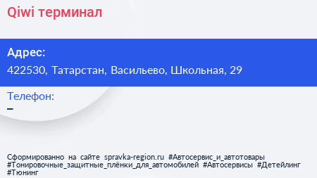 Qiwi, терминал по адресу 422530, Татарстан, Васильево, Школьная, 29 в дальнейшем Организация, размещена в следующих категориях: