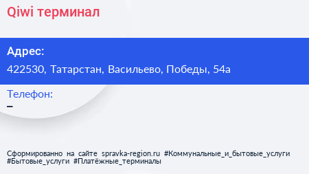 Qiwi, терминал по адресу 422530, Татарстан, Васильево, Победы, 54а в дальнейшем Организация, размещена в следующих категориях: