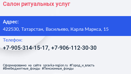 Салон ритуальных услуг по адресу 422530, Татарстан, Васильево, Карла Маркса, 15 в дальнейшем Организация, размещена в следующих категориях: