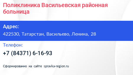 Поликлиника, Васильевская районная больница по адресу 422530, Татарстан, Васильево, Ленина, 28 в дальнейшем Организация, размещена в следующих категориях: