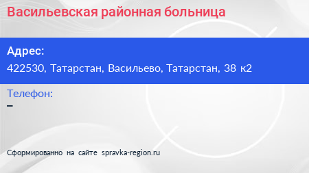 Васильевская районная больница по адресу 422530, Татарстан, Васильево, Татарстан, 38 к2 в дальнейшем Организация, размещена в следующих категориях: