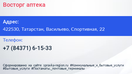 Восторг, аптека по адресу 422530, Татарстан, Васильево, Спортивная, 22 в дальнейшем Организация, размещена в следующих категориях: