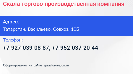 Скала, торгово-производственная компания по адресу Татарстан, Васильево, Совхоз, 10Б в дальнейшем Организация, размещена в следующих категориях:
