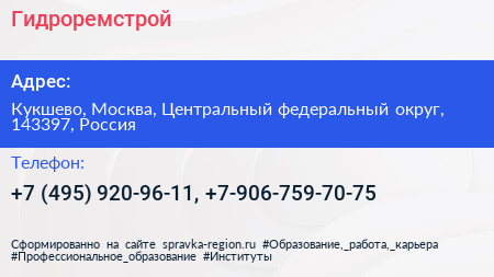 Гидроремстрой по адресу Кукшево, Москва, Центральный федеральный округ, 143397, Россия в дальнейшем Организация, размещена в следующих категориях: