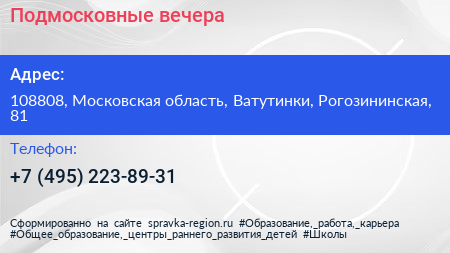 Подмосковные вечера по адресу 108808, Московская область, Ватутинки, Рогозининская, 81 в дальнейшем Организация, размещена в следующих категориях: