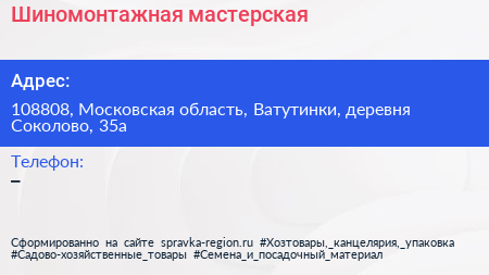 Шиномонтажная мастерская по адресу 108808, Московская область, Ватутинки, деревня Соколово, 35а в дальнейшем Организация, размещена в следующих категориях: