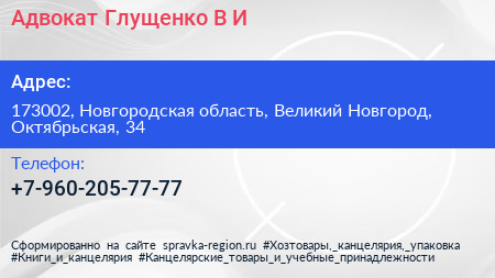 Адвокат Глущенко В.И. по адресу 173002, Новгородская область, Великий Новгород, Октябрьская, 34 в дальнейшем Организация, размещена в следующих категориях: