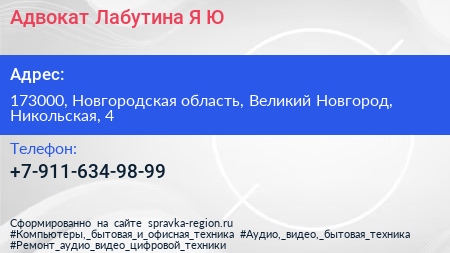 Адвокат Лабутина Я.Ю. по адресу 173000, Новгородская область, Великий Новгород, Никольская, 4 в дальнейшем Организация, размещена в следующих категориях: